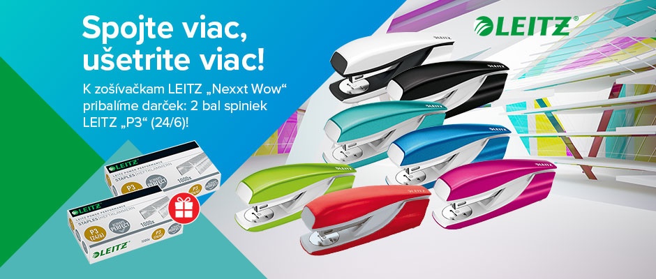 K zošívačkam LEITZ „Nexxt Wow“ pribalíme darček: 2 bal spiniek LEITZ „P3“ (24/6)!